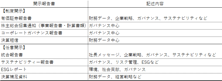 制度開示の代表は、決算時に公表される決算短信で速報性が重視されます。有価証券報告書は、財務データを中心に、企業戦略、ガバナンス、サステナビリティーなどが網羅的に記載され、100ページを超えるものが多いです。コーポレートガバナンス報告書は、コーポレートガバナンス・コードの原則への対応を示したもので、「資本コストと株価を意識した経営の実現に向けた対応」はこの中に記載されます。