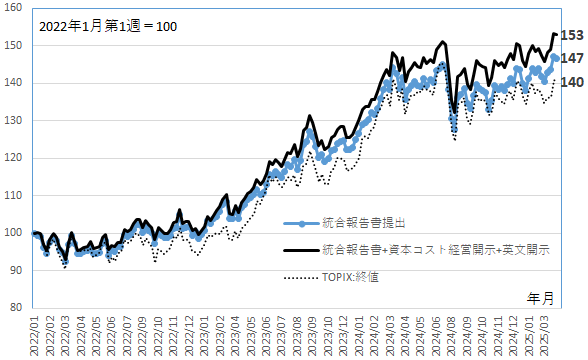 (注2)統合報告書+資本コスト+英文開示:(注1)の企業から「資本コストや株価を意識した経営の実現に向けた対応」の英文開示企業(2025年2月)661社。株価は3月25日現在