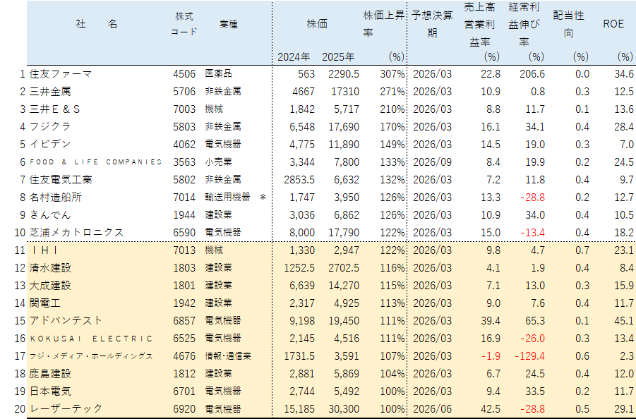 どのような銘柄が今年上昇するのかをあてることは難しいですが、昨年の株価上昇上位企業がいくつかの気づきを与えてくれます。下表に全上場企業から昨年1年間の株価上昇率上位20社を示しました。出来高、時価総額の小さい銘柄は手口によって大きく上昇することがあるため、2024年12月末で時価総額が100億円以上、売買代金で1億円以上の銘柄のランキングです。多くのデータをみましたが、紙幅の関係で関係のありそうなもののみの掲載としました。
