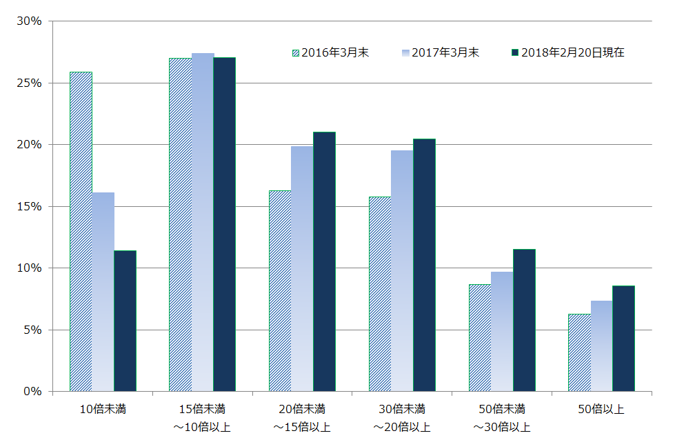 この図表をみると、2016年3月末に比較して、直近(2月20日)ではPER10倍未満の銘柄構成比が大幅に減少、15倍以上の構成比が増えていることがわかります。20倍以上の銘柄の構成比は、31%から41%に上昇しています。利益成長を考慮しても割高と考えられ、投資判断を引き下げざるを得ない銘柄が増えています。