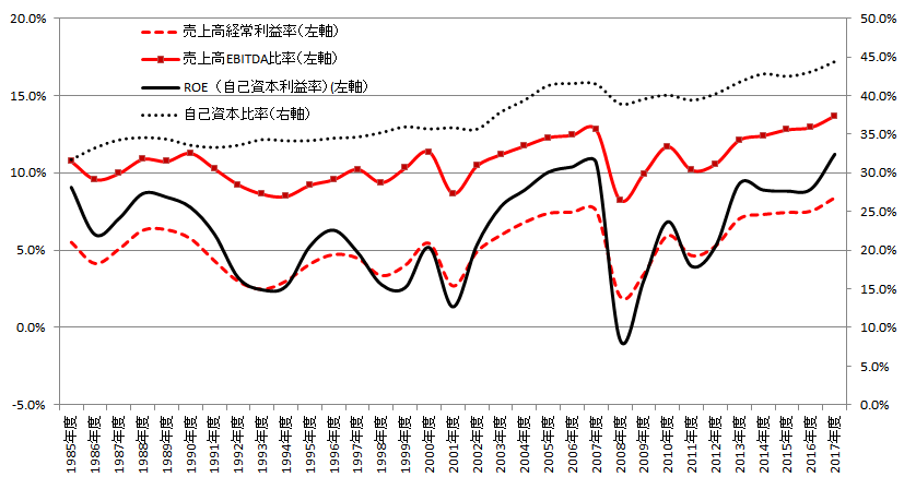上場企業の体質強化も進んでいます。図表には1985年から継続して財務データが取得可能な企業229社の収益性、安全性指標の推移を示しました。業種構成による変動要因を除くため、集計は製造業のみとなっています。これをみると、収益性を示す売上高経常利益率、さらに設備投資に伴う減価償却費、企業買収によって発生するのれん償却を足し戻した売上高EBIDA比率ともに1985年度以降の最高水準にあります。ROEも10%を超えています。安全性を示す自己資本比率も45%近くまで改善です。2018年度の増収率、増益率は前期に比べて大幅な鈍化が予想されるので、成長性に関しては弱いと言わざるをえませんが、日本企業の着実な収益力向上が見て取れます。