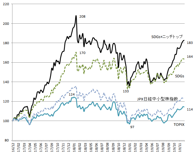 この両者を満たす企業の株価推移を示したのが下の図表です。2016年12月末を基準(100)として、SDGsが大きく注目され始めた2017年以降の各企業の株価パフォーマンスを単純平均したものです。直近(2019年12月23日)では183となっており、東証株価指数(TOPIX)、JPX日経中小型株指数を大きく上回っています。SDGs関連の株価パフォーマンスも良好ですが、ニッチトップの視点を加えた企業群のパフォーマンスのほうが総じて高いようです。2018年2月の最高値を超えていないこと、変動が大きいことが気になりますが、対象企業数が絞り込まれた結果、一部の企業の株価変動の影響が大きくなっているためとみられます。