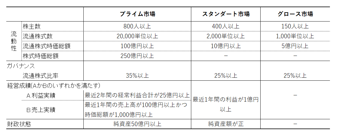 なお、新市場区分の基準に適合しない企業も、適合に向けた計画書を提出すれば緩和した上場維持基準が適用されることになります。そのため、東証 1部上場企業は、新市場の上場基準を満たさなくても、最も注目度の高いプライム市場に留まることができます。
