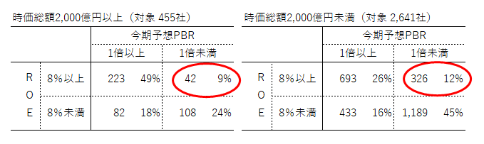 一方、自己資本利益率(ROE)が期待収益率8%以上にもかかわらず、PBR1倍割れ企業も多く存在します。図表では時価総額2,000億円を境にして大型株と中小型株に分け、ROEとPBRの分布を示しました。時価総額2,000億円以上では、ROE8%以上でPBR1倍未満は9%、40社強に留まりますが、時価総額2,000億円未満の中小型株企業では12%、320社強あります。