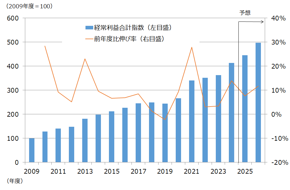 2025年度について、製造業、非製造業別にみると、製造業は2024年度比3.7%増収、同8.3%営業増益、同4.9%経常増益、非製造業は同7.9%増収、同11.2%営業増益、同10.2%経常増益の見込み。2026年度については、製造業は2025年度比5.7%増収、同12.0%営業増益、同12.5%経常増益、非製造業は同5.2%増収、同11.3%営業増益、同11.0%経常増益が予想される。