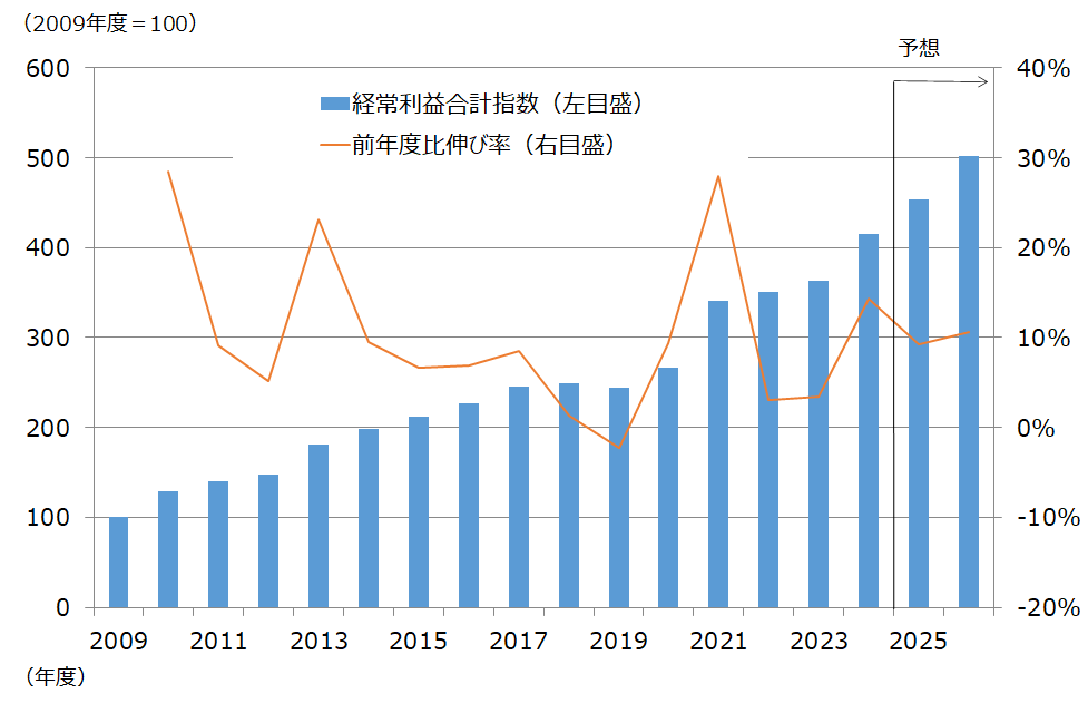 図表2は各年度の当経済研究所のカバレッジ銘柄の経常利益合計額の伸び率を指数化(2009年度=100)したものである。当経済研究所では成長企業をフォローし続けているため、経常利益は2019年度を除き増加基調が続いている。2024年度(実績)は前年度比14.3%増、2025年度同9.2%増、2026年度同10.6%増とTOPIX500(除く金融)を上回る伸びが見込まれる。