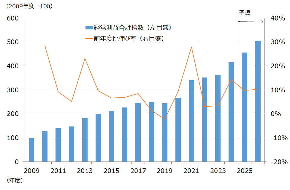 図表2は各年度の当経済研究所のカバレッジ銘柄の経常利益合計額の伸び率を指数化(2009年度=100)したものである。当経済研究所では成長企業をフォローし続けているため、経常利益は2019年度を除き増加基調が続いている。2024年度(実績)は前年度比14.3%増、2025年度同9.7%増、2026年度同10.3%増とTOPIX500(除く金融)を上回る伸びが見込まれる。