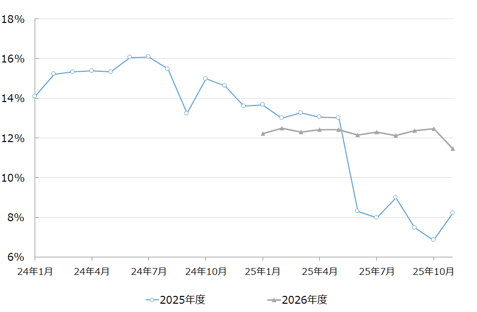 図表3は時系列に当研究所アナリスト業績予想データが取得可能な302社の2025年度と2026年度の経常利益の伸び率を月別にみたものである。11月の伸び率は10月に比べて、2025年度は上方修正、2026年度は若干下方修正(2025年度は前年度比6.8%増→8.2%増、2026年度は前年度比12.5%増→11.5%増だが水準は上昇)となった。
