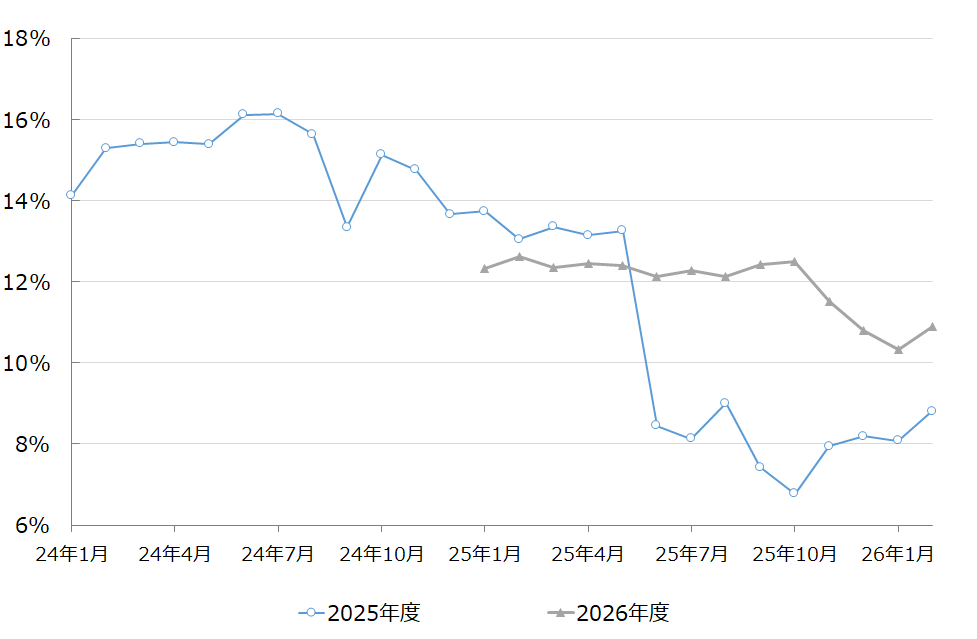 図表3は時系列に当研究所アナリスト業績予想データが取得可能な294社の2025年度と2026年度の経常利益の伸び率を月別にみたものである。2月の伸び率は1月に比べて、2025年度、2026年度ともに上方修正(2025年度は前年度比8.1%増→8.8%増、2026年度は前年度比10.3%増→10.9%増)となった。