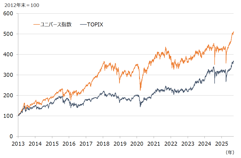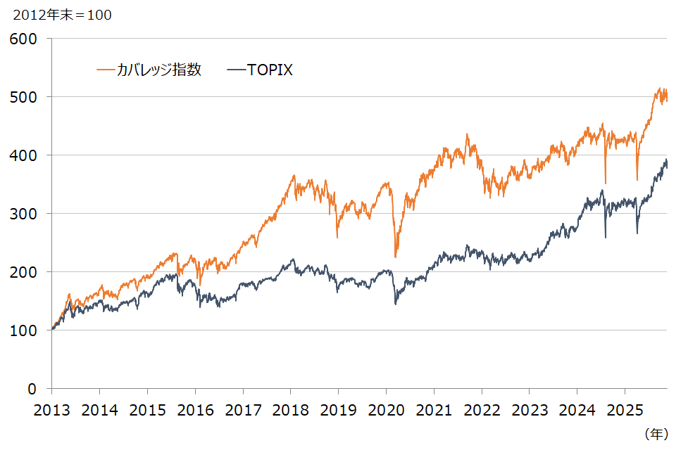 TOPIXはコロナ禍で大幅な調整となった20年3月16日を底にして反発、大幅な変動を伴いながらも上昇局面に入り、24年7月11日に20年3月のボトム比137%上昇の340.68の史上最高値をつけた。その後、24年8月5日、25年4月7日の2度にわたって一時的な調整を迎えたものの、先行き不透明感が薄まるにつれて、株式先物の上昇に呼応して、力強い上昇局面が続いた。この結果、25年10月15日には370.27(24年7月11日高値比9%上昇)となった。一方、カバレッジ指数は、大型株主導の上昇に対して中小型株出遅れの影響を受け、24年7月11日までの上昇局面においてはTOPIXより小幅な上昇にとどまったものの、中小型株見直しの気運が高まったことで、比較的に堅調なパフォーマンスが続いた。しかし、自民党総裁選以降の積極財政期待の株価急伸(いわゆる高市トレード)にはやや遅れをとる結果となったが、25年10月15日の終値は495.88(24年7月11日比9%上昇)へ回復した。なお前月号作成時点(9月17日)との比較では、TOPIX が1.2%の上昇、カバレッジ指数が2.3%の下落となった。