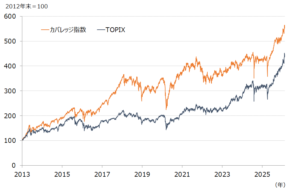TOPIXはコロナ禍で大幅な調整となった20年3月16日を底にして反発、大幅な変動を伴いながらも上昇局面に入り、24年7月11日に20年3月のボトム比137%上昇の340.68のコロナ後の史上最高値をつけた。その後、24年8月5日、25年4月7日と2度にわたって一時的な調整を迎えたものの、先行き不透明感の払拭、企業収益の回復期待を背景に、株式先物の上昇に呼応して、力強い上昇局面が続いた。この結果、26年2月18日には442.81(24年7月11日高値比30%上昇)となった。一方、カバレッジ指数は、大型株主導の上昇に対して中小型株出遅れの影響を受け、24年7月11日までの上昇局面においてはTOPIXより小幅な上昇にとどまったものの、中小型株見直しの気運が高まったことで、比較的に堅調なパフォーマンスが続いた。しかし、石破前総理の退陣表明以降の積極財政期待の株価急伸には遅れをとる結果となり、25年9月以降はもみ合いの後上昇する展開となった。26年1月21日の終値は564.73(24年7月11日比24%上昇)となった。なお前月号作成時点(1月21日)との比較では、TOPIXが6.1%上昇 、カバレッジ指数が4.7%の上昇となった。
