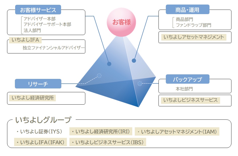 いちよしグループでは独自の「トライアングル・ピラミッド経営」を実践しています。 「お客様サービス」、「商品・運用」、「リサーチ」、「バックアップ」の正三角形4面体でそれぞれを支えあうことにより、各部門及び関係各社の機能を最大限に発揮させることを目的とした経営スタイルです。
